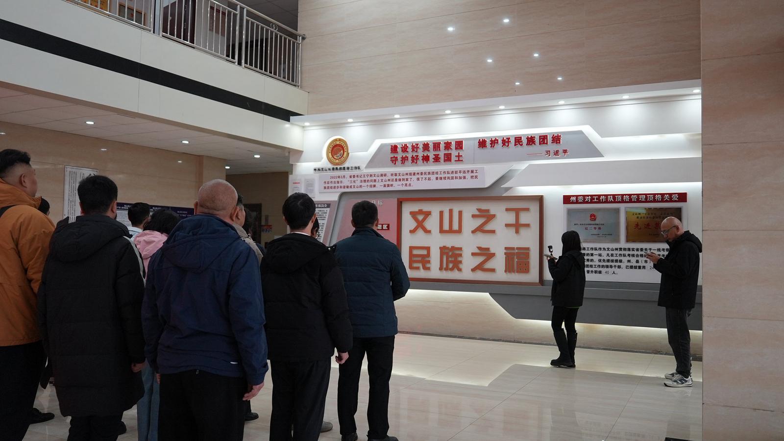 在平远镇铸牢中华民族共同体意识主题馆,一幅幅图片、一件件实物,生动呈现了文山州各族群众守望相助、团结奋斗的感人历程。大家还实地走访了迎丰路“民族团结幸福路”,这里的“拆墙透绿”工程不仅打通了物理空间,更促进了邻里间的情感交融。沿路丰富的民族团结标语与特色文化景观,吸引了大家频频驻足、深入交流。