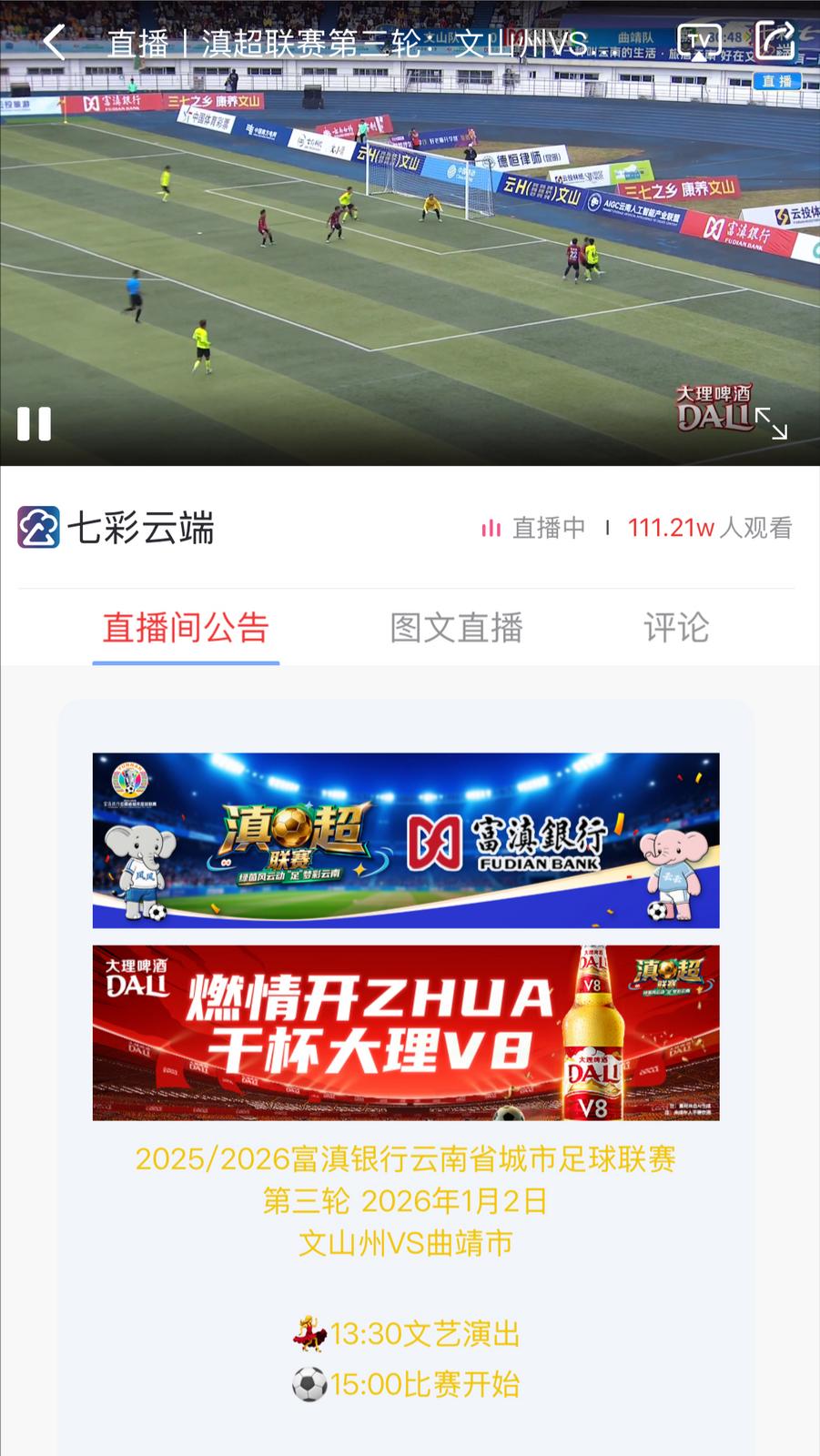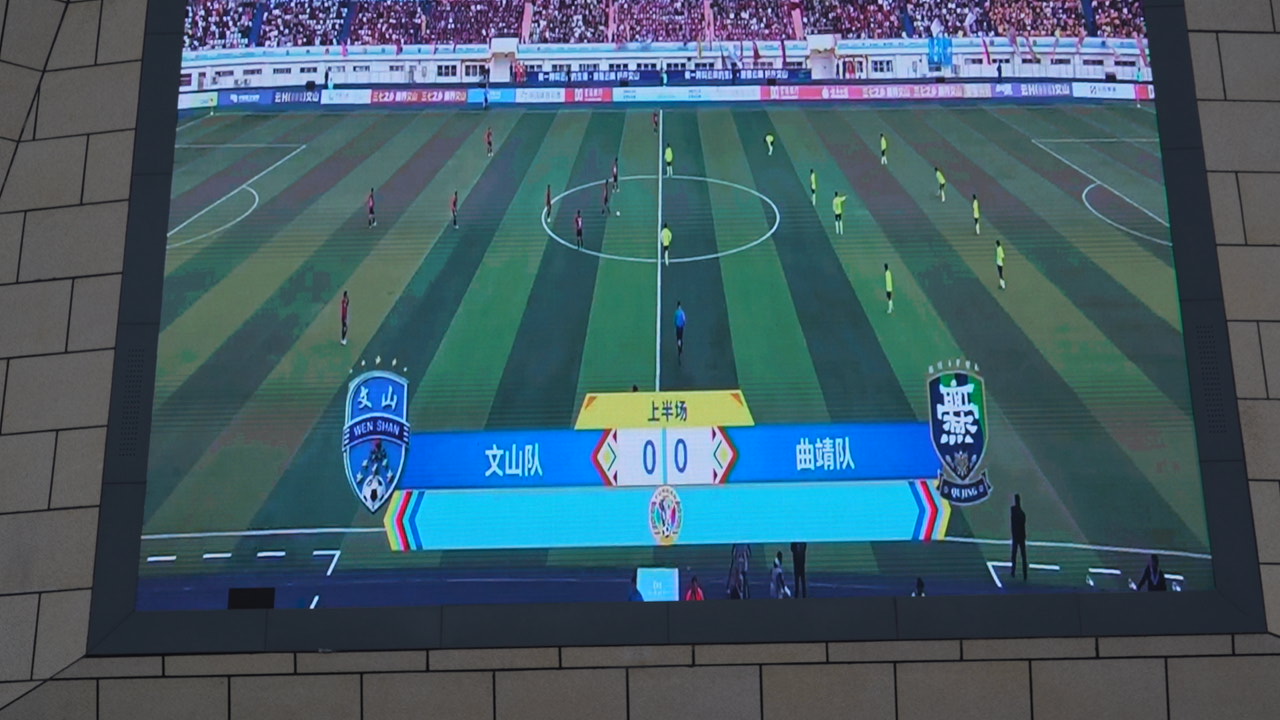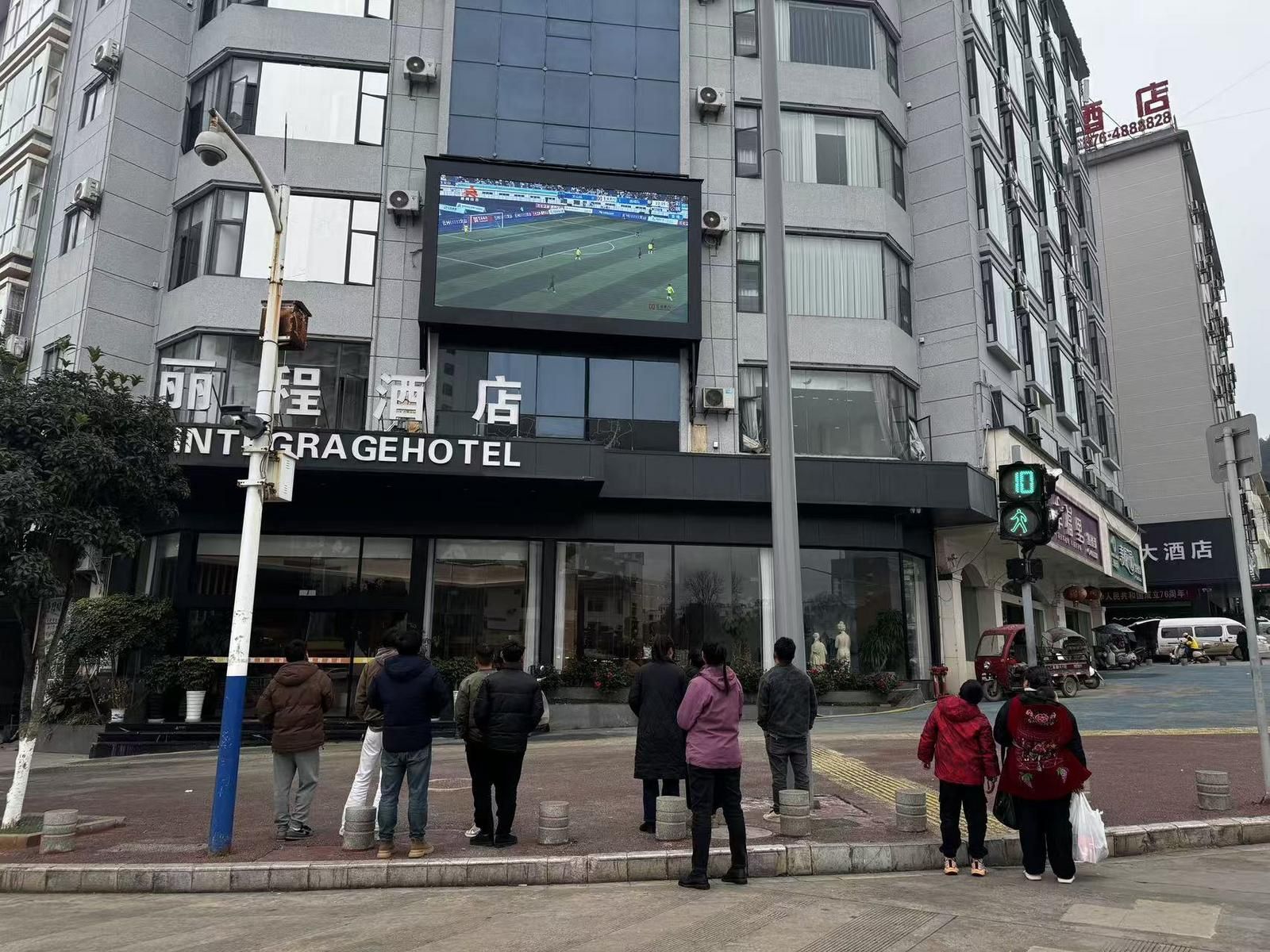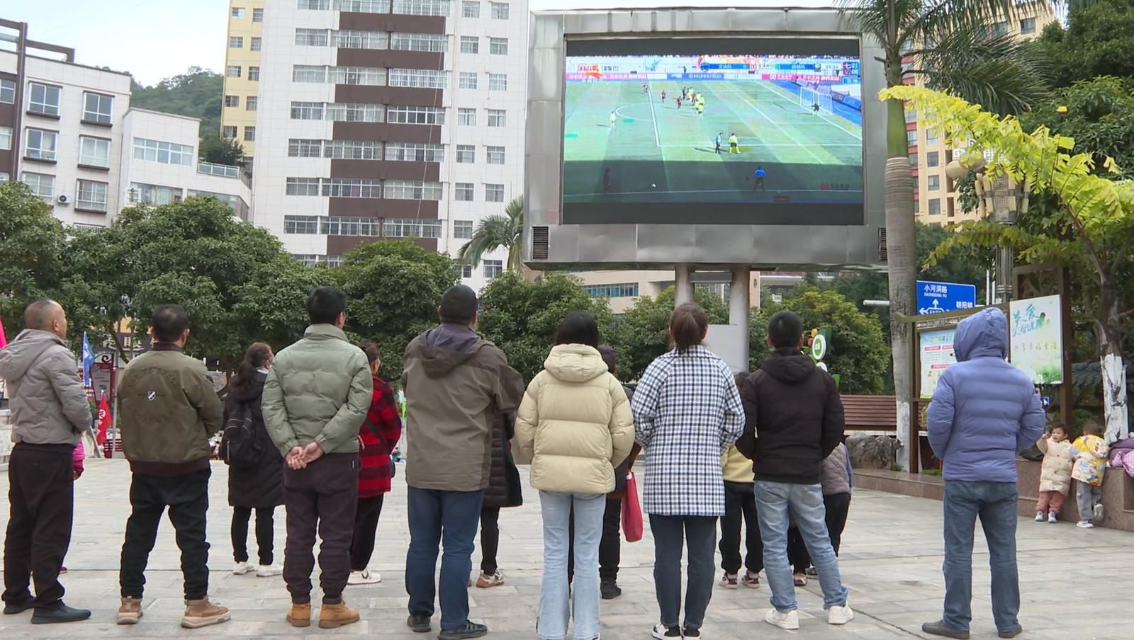 丘北县椒莲广场旁的大屏前,群众驻足观看“滇超”第三轮文山VS曲靖直播赛