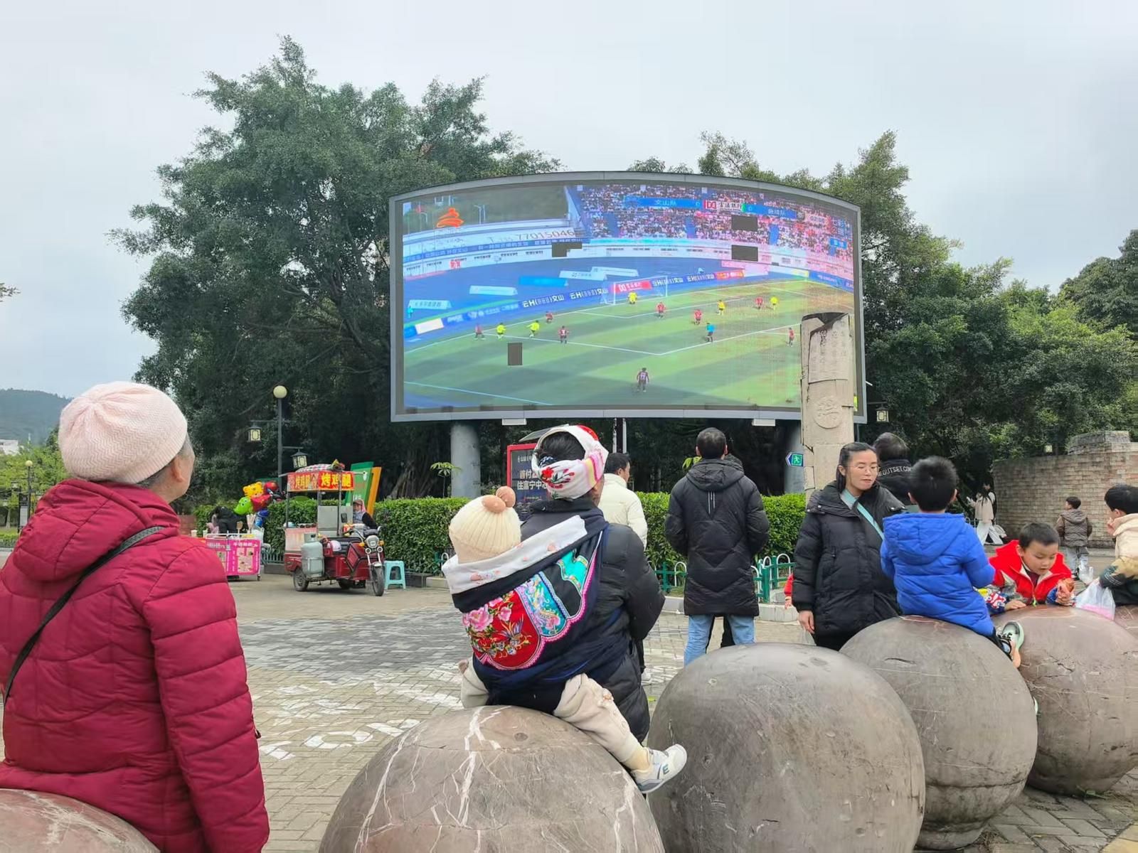 富宁县白越公园大屏前,群众驻足观看“滇超”第三轮文山VS曲靖直播赛
