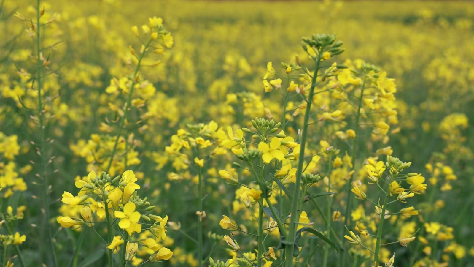 微风拂过,花海泛起层层涟漪,金色的波浪随风涌动,裹挟着淡淡的花香扑面而来,令人心旷神怡。连片的油菜花田沿着田埂、山坡绵延开去,与远处的青山、错落的村落相互映衬,构成了一幅动静相宜的田园美景图。