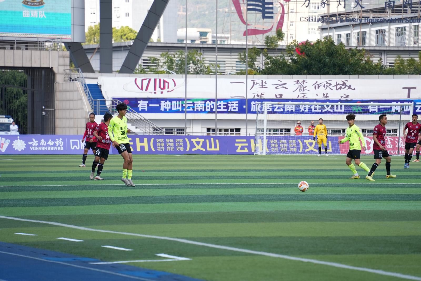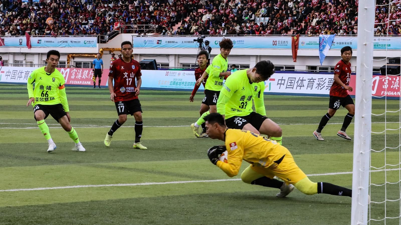 开赛7分30秒左右,曲靖队就以超远射门攻进第一个球,下半场又保持进攻水准踢进一个任意球。