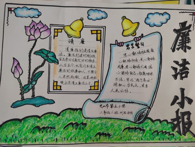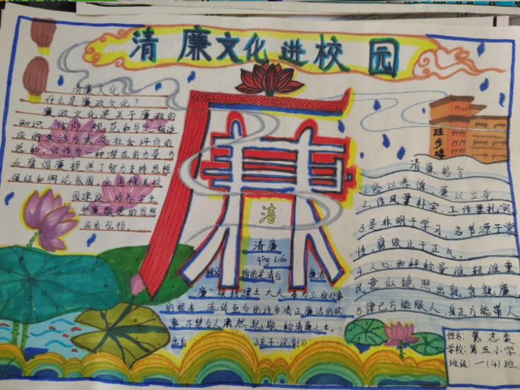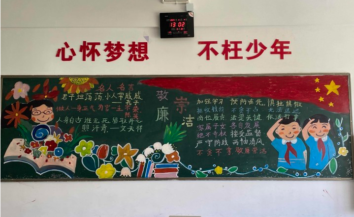 学校以校园文化建设为载体,营造廉政文化教育氛围,在校园走廊悬挂英雄模范画像、名言警句,创设廉洁的文化环境,营造廉洁的文化氛围。丰富廉洁文化活动,开展格言警句征集、唱廉洁歌、绘廉洁画、办廉洁报等主题教育活动,通过组织开展“廉洁文化进校园主题征文”“廉洁文化进校园现场绘画比赛”“唱红歌比赛”等活动,使清廉教育根植于心,全面培养学生学廉、思廉、践廉的意识。